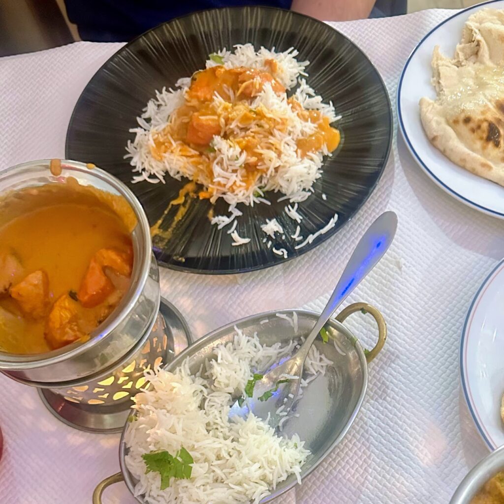 Butter chicken, rice, and naan