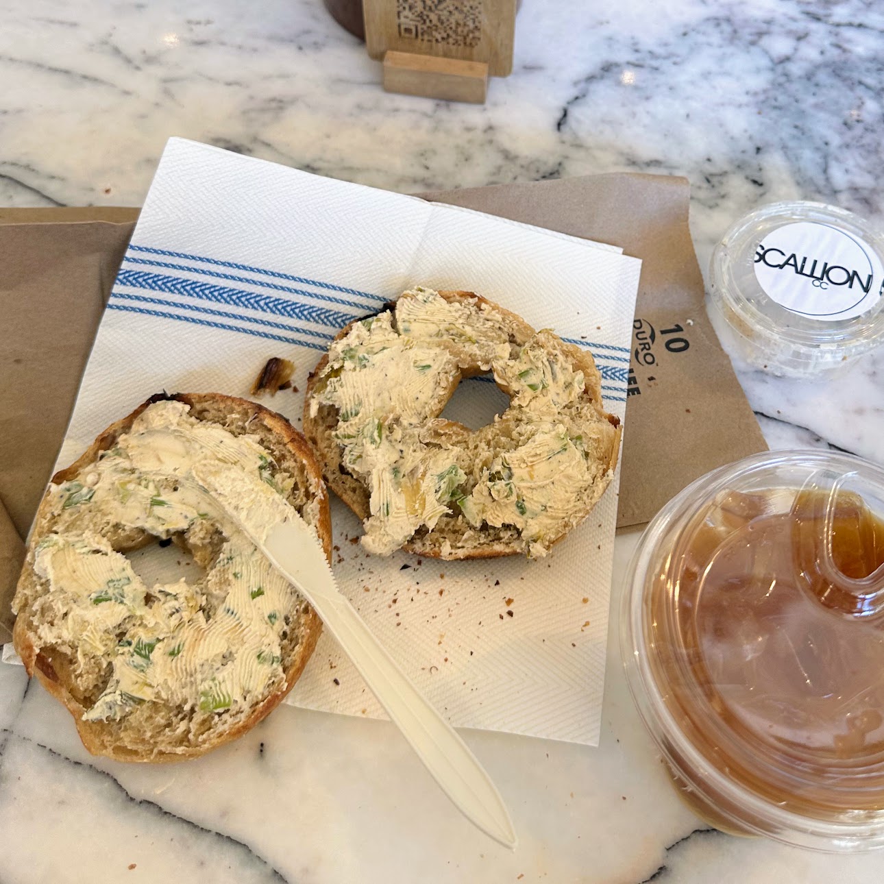 Plain bagel with charred scallion cream cheese and cold brew