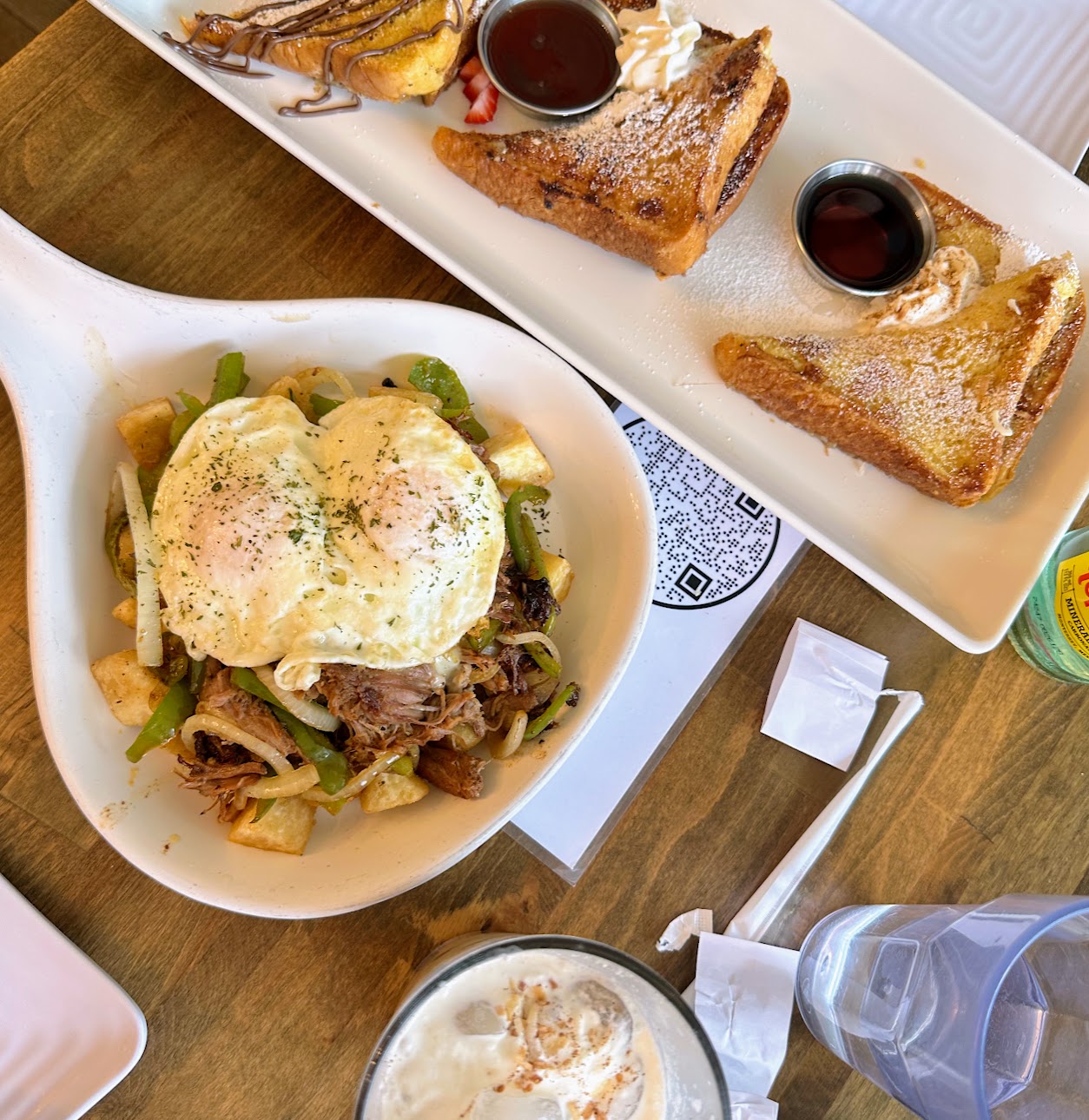 French toast flight, yuca pulled pork skillet, and coquito latte