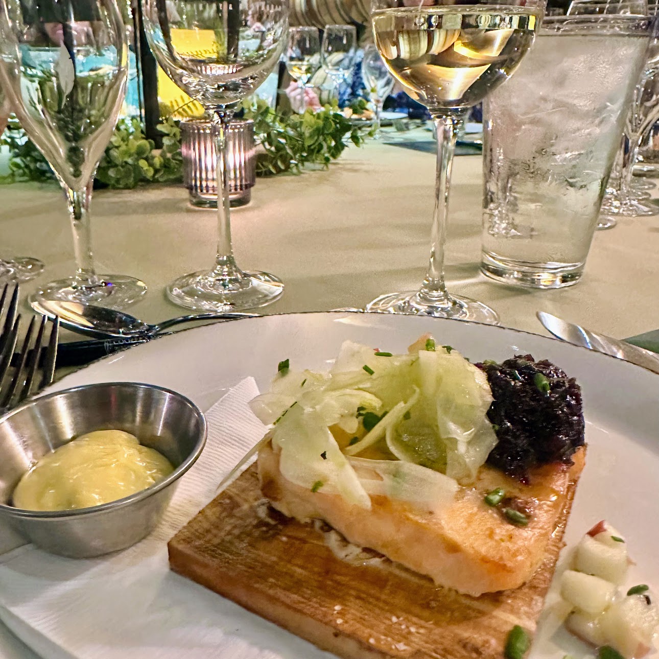 Chilled cedar plank salmon at Wine and Wanderlust wine dinner
