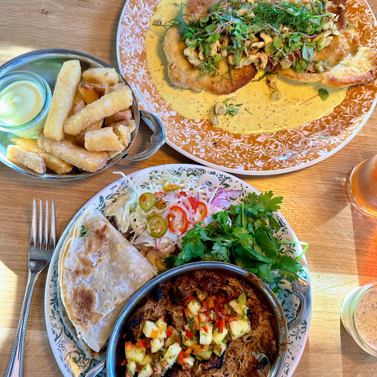 Duck confit tacos, schnitzel of Berkshire pork, and salt and vinegar chips