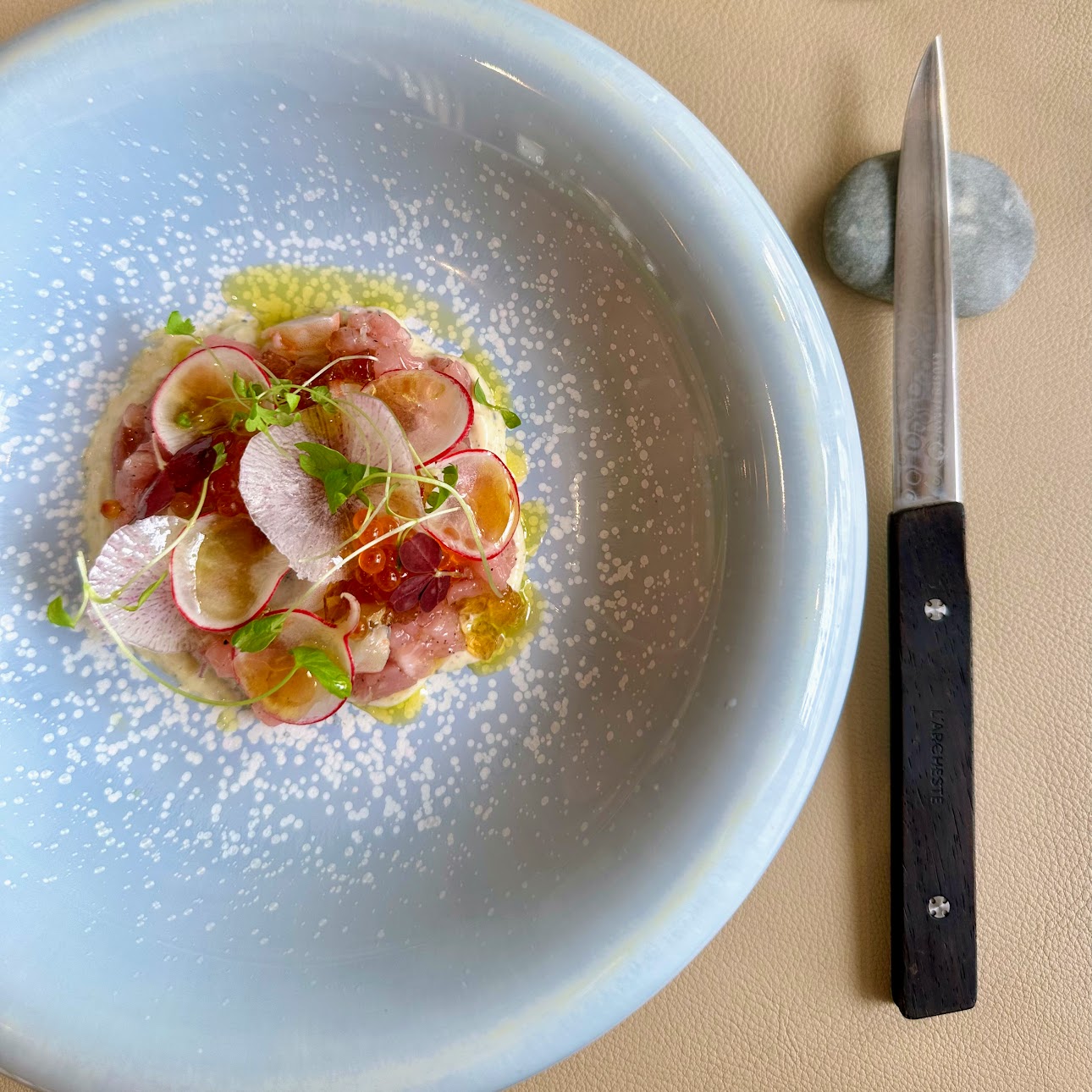 Veal and shrimp tartare from lunch tasting menu