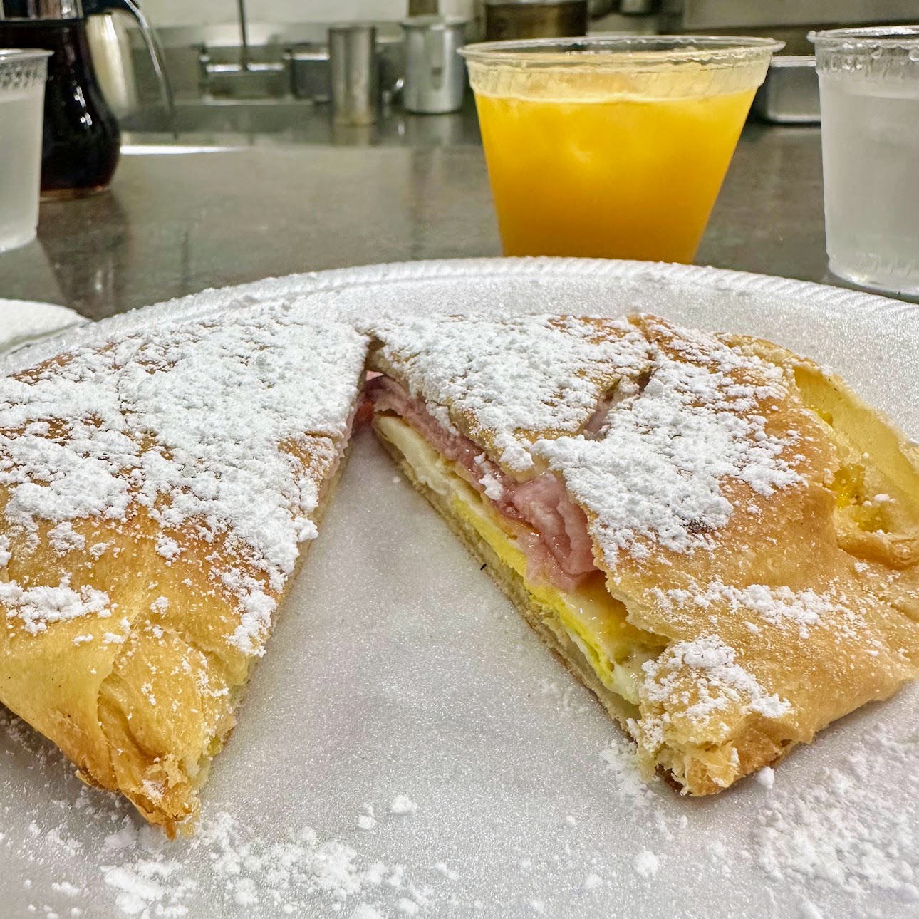 Ham, egg, and cheese mallorca with orange juice