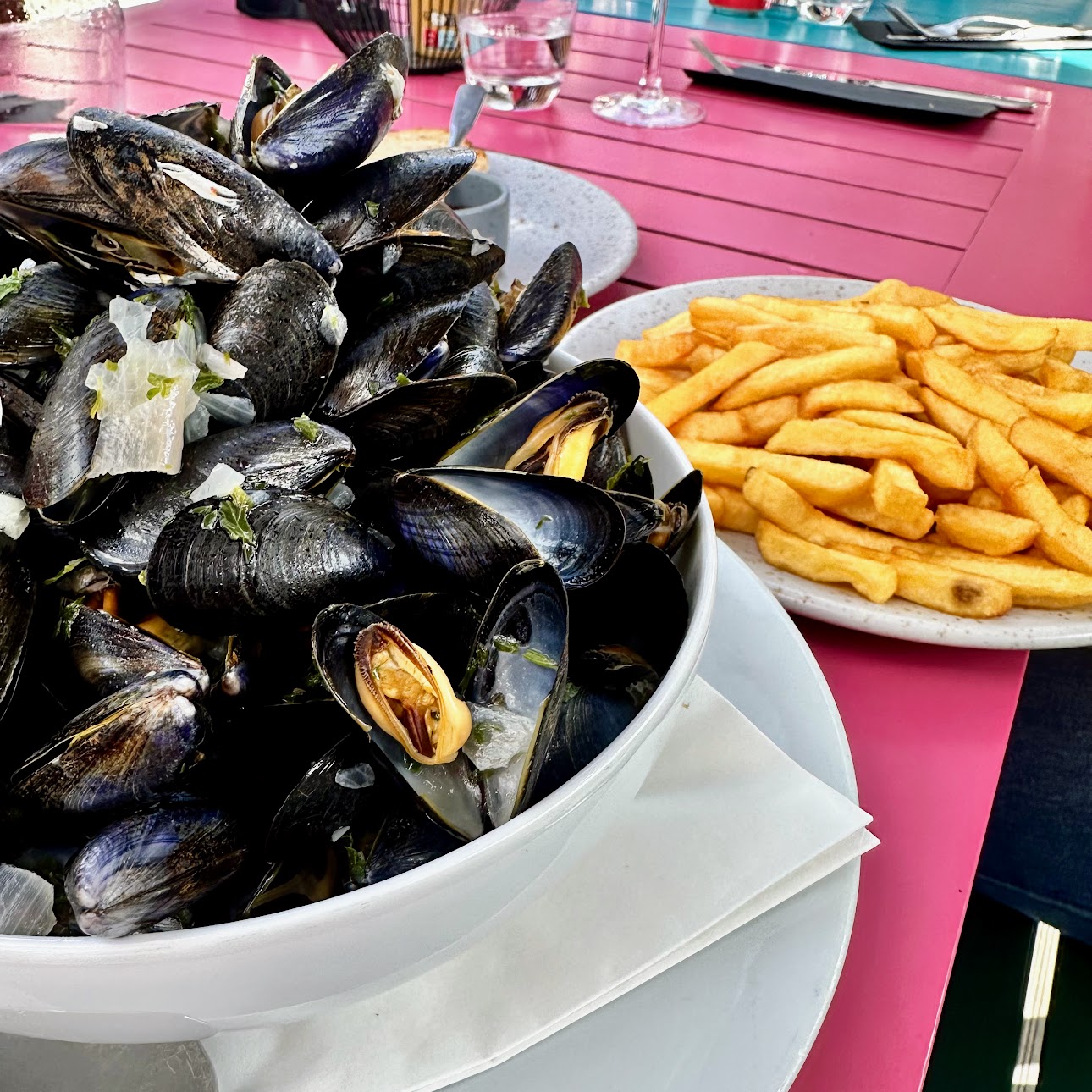 Moules marinière and fries